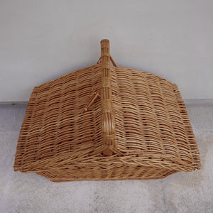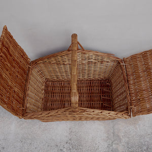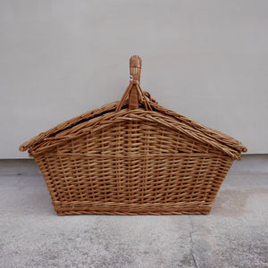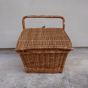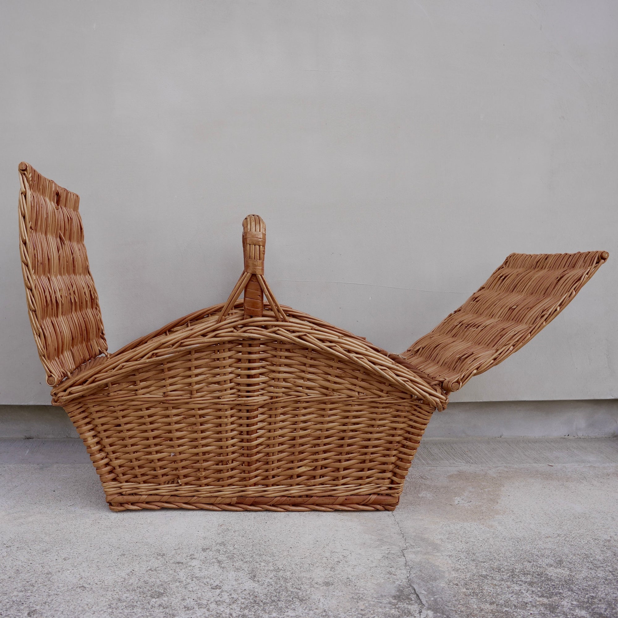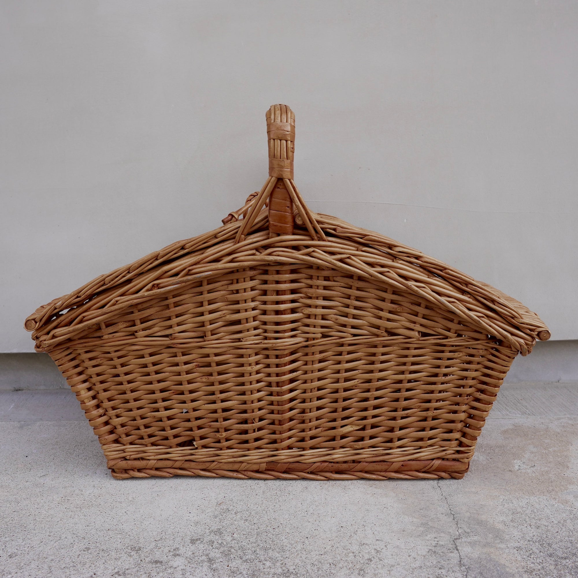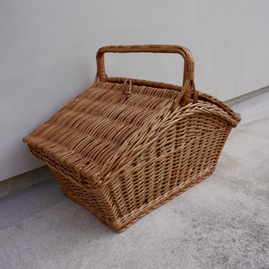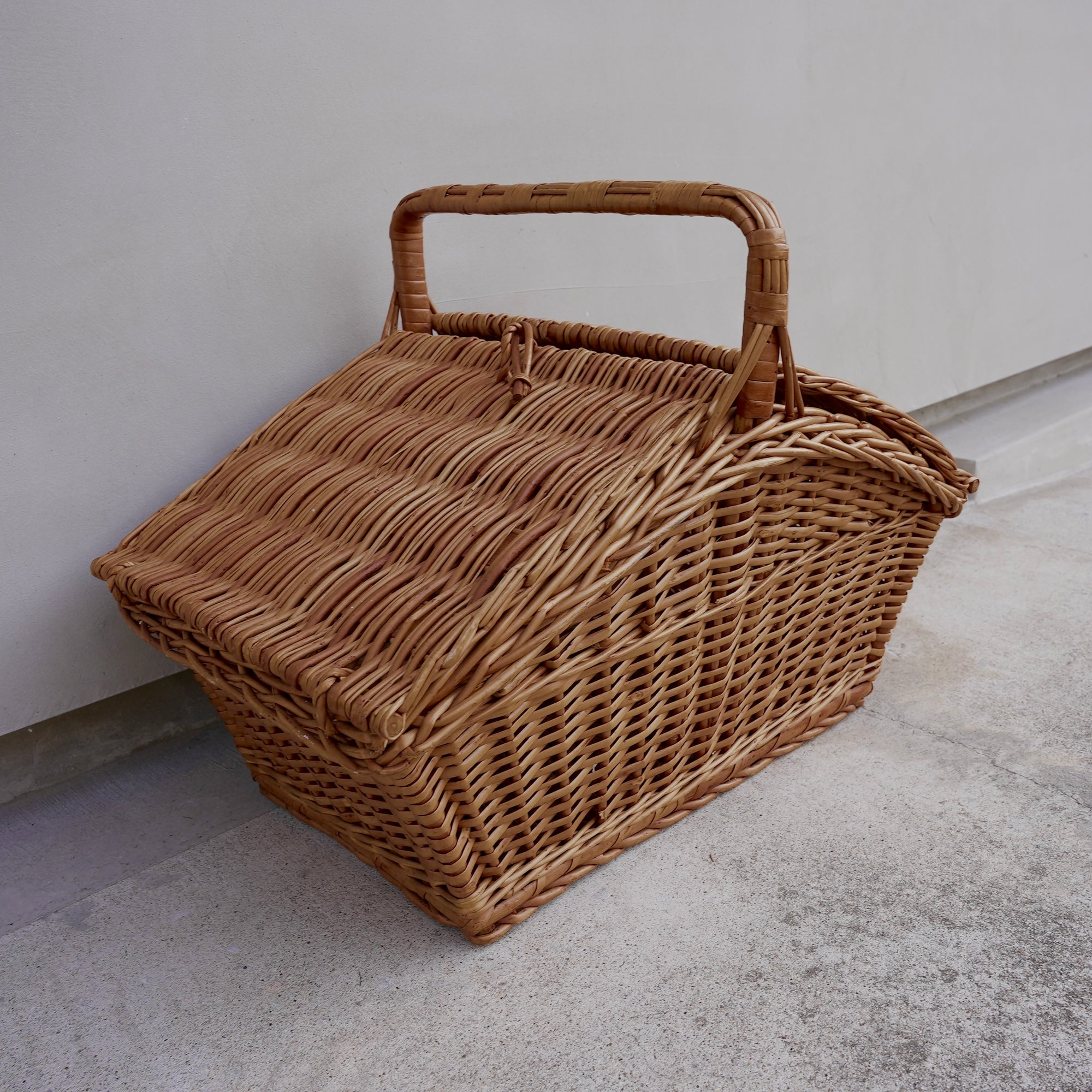 三角屋根のような形の両開きの蓋が付いています。片側の蓋は一度取れてしまったようで、直された跡があり蓋の開き具合が少し違いますがそこはご愛嬌。大ぶりなのでたくさん収納できます。