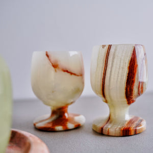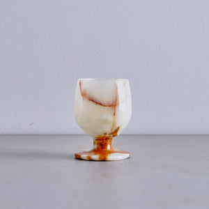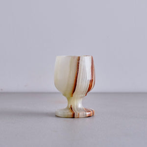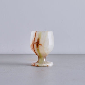 脚が短く、丸みのある小ぶりなシルエットが特徴的なグラスです。ボウル部分は石が光を透かすほどに薄く形成されています。また天然の石が生み出した模様は美しく、見る向きによって全く違った印象が感じられます。ひとつひとつ違う模様はどれも美麗で魅力的なため、いつまでも眺めていられるようです。ディスプレイやちょっとした小物入れにもいかがでしょうか。