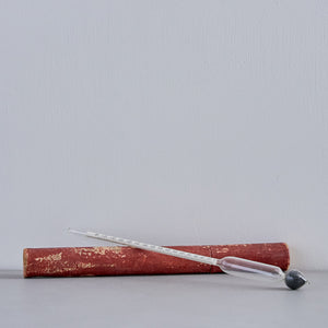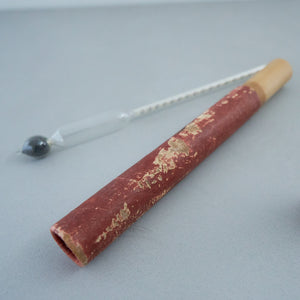少し色褪せたレッドカラーの筒には密度計が入っています。密度計とはその名の通り液体の密度を測定する装置のこと。ガラス製であることや内部のメモリが書かれた紙の質感などが、レトロな雰囲気を出しています。実際に使うことは少ないと思いますが、ディスプレイとしておすすめです。