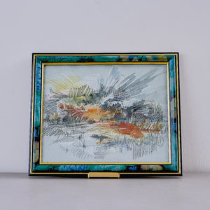 ブルーグリーン系統の色味のマーブル模様が美しい額縁には、力強いタッチの絵画が入れられています。勢いある筆の動きや色使いで構成されたこの絵は、抽象画のようにも風景画のようにも見えてきます。また、絵の色味と額縁の色味がよく合い、額縁のブラックやゴールドもアクセントになり高級感を出しています。壁掛けのインテリアとしておすすめです。